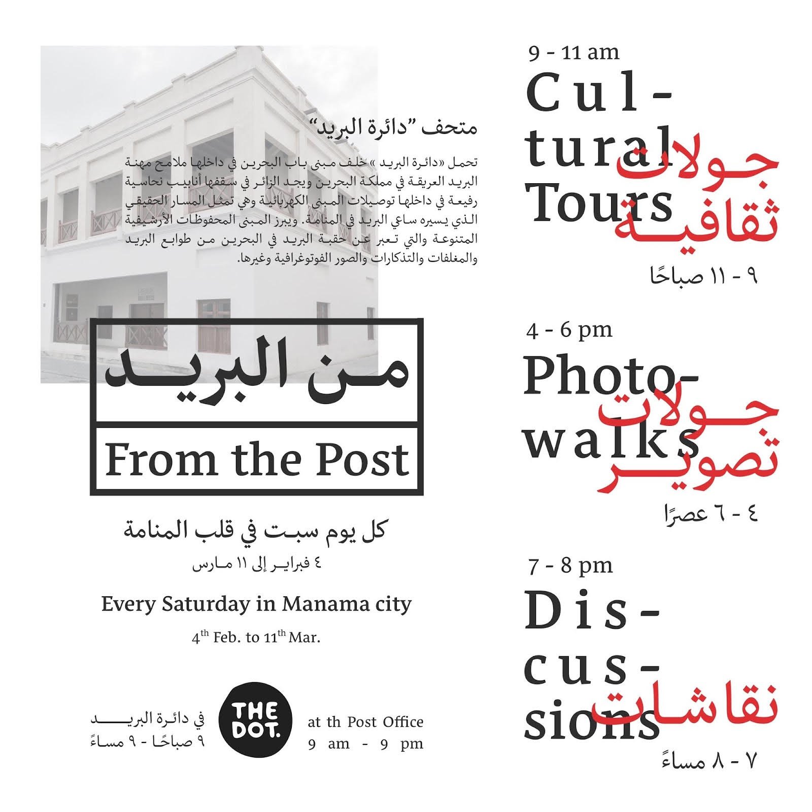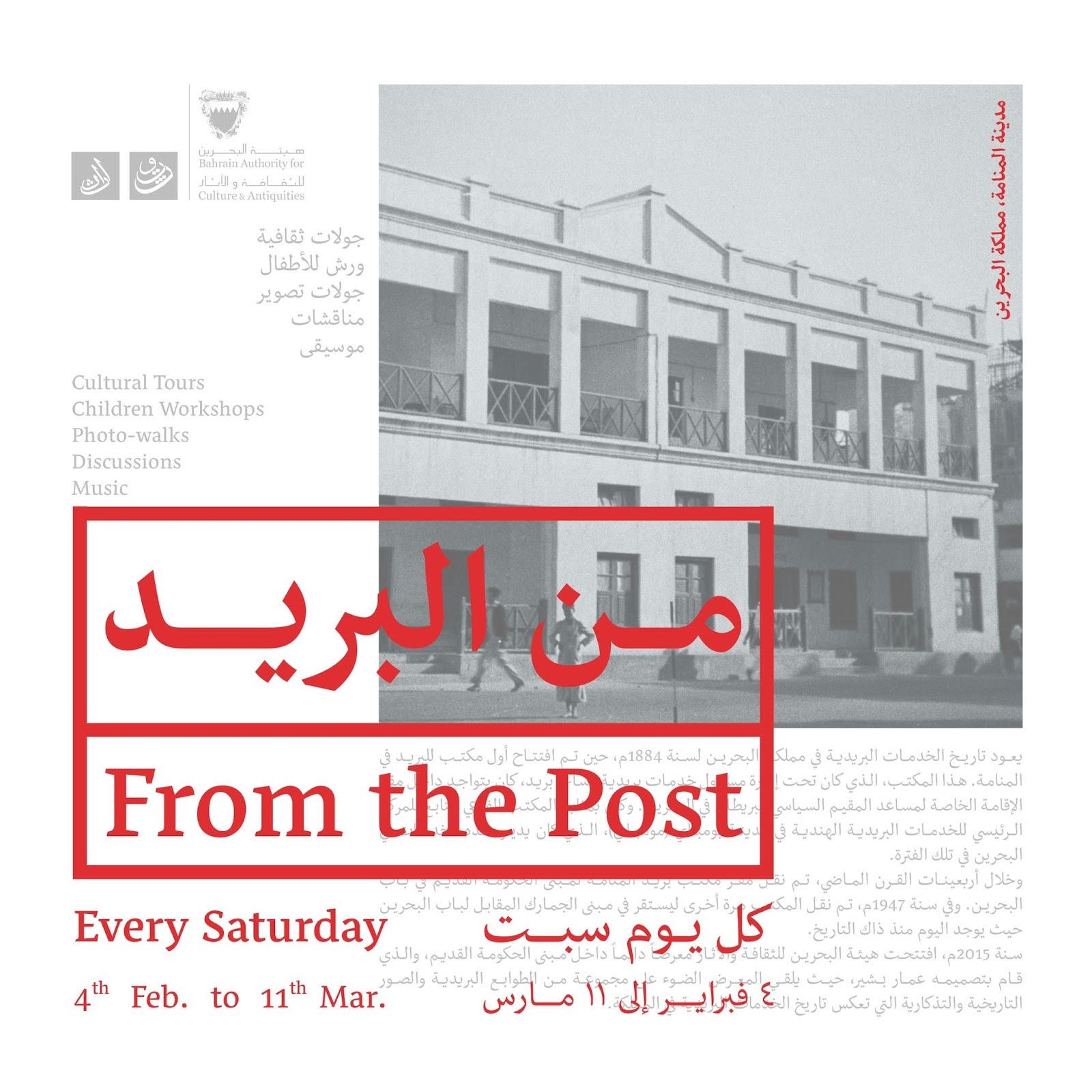 و كان تاج ما شارك مختبر المنامة في صناعته، هو فعالية “من البريد” من تنظيم هيئة البحرين للثقافة والآثار. وهي تجربة مكانية امتدت لستة أيام سبت متتالية، احتفِيّ خلالها بهوية مدينة المنامة و تاريخها العميق، عبر تحديد موضوع محوري لكل أسبوع، وذلك كله في متحف البريد، أولأولى متاحف البحرين المتخصصة، وموقع أول مكتبٍ بريديّ في الخليج. ساهم مختبر المنامة في صنع الهوية العامة للتجربة، من الاستراتيجية العامة واختيار الشخصيات المساهمة إلى اللغة البصرية المستخدمة.